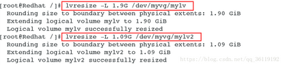 我们之前分配的 mylv 是1G ,mylv2是500M ,现在我们把mylv拉伸到1.9G,mylv2拉伸到1.1G。这样,就用完了卷组的空间了
