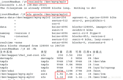通知文件系统 resize2fs /dev/myvg/mylv (EXT文件系统) xfs_growfs /dev/myvg/mylv (XFS文件系统)