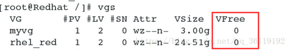 可以看到,我们的卷组的空间已经用完了。如果我们还想扩容的话,我们就需要扩大我们的卷组空间了
