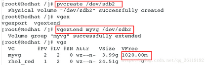 将初始化的物理卷加入卷组,vgcreate myvg dev/sdb1 ,意思是将sdb1物理卷组成myvg卷组