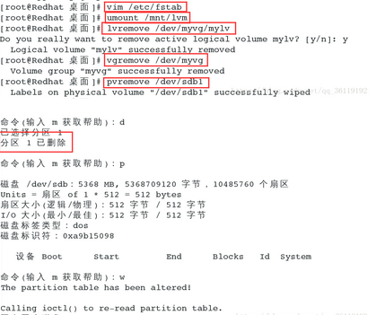 删除逻辑卷 lvremove /dev/myvg/mylv ;删除卷组 vgremove myvg ;删除卷组底层的物理卷 pvremove /dev/sdb1