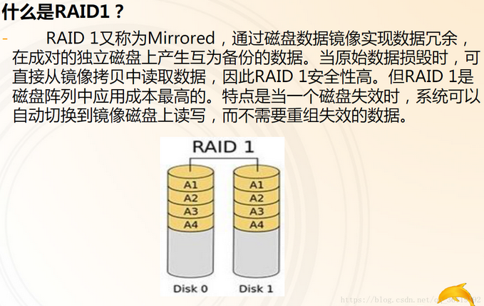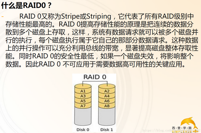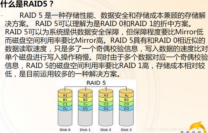 RAID(Redundant Arrays of Inexpensive Disks)容错式廉价磁盘阵列。RAID技术可以通过软件或硬件实现,将多个磁盘整合成为一个较大的磁盘装置,该装置不仅有存储功能,还具有数据保护的功能。RAID具有多个不同的等级,每个等级的对整合后的磁盘实现不同的功能。常用等级有RAID5