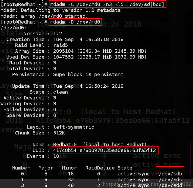第一步:建立RAID存储设备md0,并且查看其状态,记住UUID