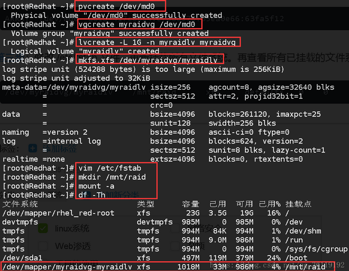 第三步:创建逻辑卷,修改配置文件,重新全部挂载。可以看到,我们的基于RAID的逻辑卷已经成功挂载了。