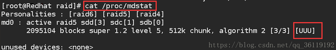 先查看 RAID 状态 ,可以看到,三块硬盘都是正常的。cat /proc/mdstat