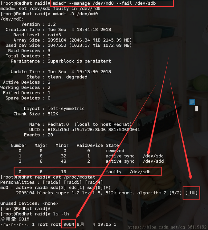 可以看到 ,sdb已经挂了 。但是我们的900M的文件还是依然完好无损