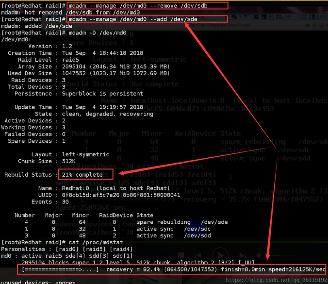 那我们先把挂了的 sdb 移除,然后加上一个好的 sde 。madam --manage /dev/md0 --remove /dev/sdb madam --manage /dev/md0 --add /dev/sde 可以看到,加上sde后,三个硬盘又组成了RAID。sde会同步其他两块硬盘上的数据