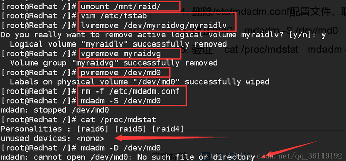 删除阵列中创建的逻辑卷,卷组,物理卷: lvremove,vgremove,pvremove