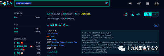 在fofa中通过搜索关键字:title="jumpserver",可以搜索到运行在互联网上的jumpserver
