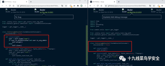 通过对比修复前后的源码,发现左边的代码在接受连接之前做了是否已经登录和是否是管理员的判断,而右边未修复的代码则没有任何判断默认接受所有连接,因此旧版本的websocket可以进行未授权连接。