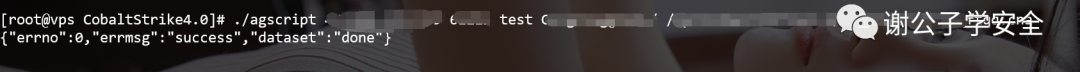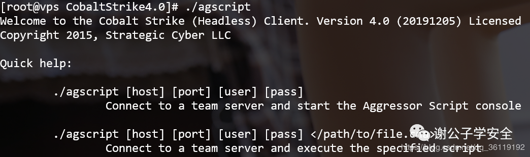 ./agscript [host] [port] [user] [pass] </path/to/file.cna>[host] #cs服务器的ip地址[port] #cs的端口号[user] #用户名,用来运行这个脚本的用户名,随便即可。[pass] #cs的密码,就是启动cs时你设置的密码。[path] #cna文件的路径。