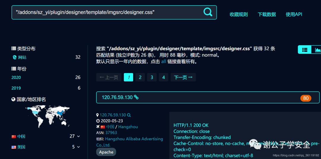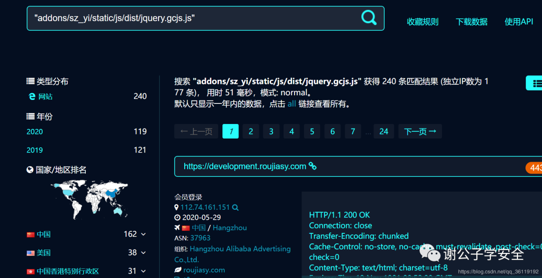 #查找title含有管理后台的iptitle="管理后台"#查找响应头含有thinkphp的ipheader="thinkphp"#查找响应包含有thinkphp的ipbody="管理后台"#查找指定根域的所有子域domain="baidu.com"#查找域名中带有指定词的iphost="test"#查找中国境内的ip,主要结合其他语句一起country=CN#搜索证书(如https证书、imaps证书等)中含有"phpinfo.me"关键词的网站和IPcert="phpinfo.me"