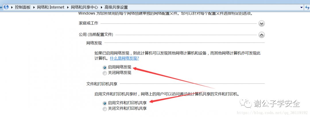 2、然后打开高级共享设置,启用网络发现和启用文件、打印机共享(实际上就是打开了TCP的445端口)