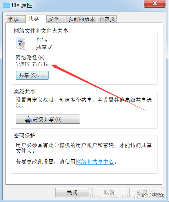 3、选择要共享的文件,右键-->属性-->共享-->然后选择一个用户名去共享,然后就会有一个访问共享文件夹的路径
