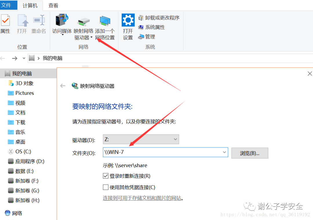 方法三:打开文件夹窗口,点击我的电脑-->计算机-->映射网络驱动器,然后输入:\\WIN-7\file ,然后用服务器的用户名和密码登录即可访问共享文件夹。(这种方法连接的时候要输入具体共享的文件名)