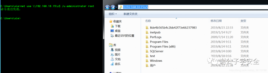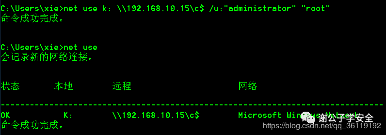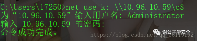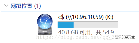 黑客还可以通过命令行把你的默认共享的盘符挂载到本地:net use k: \\10.96.10.59\c$ 把10.96.10.59计算机上的C盘挂载到本地的k盘,这里的认证用户只能是 administrator