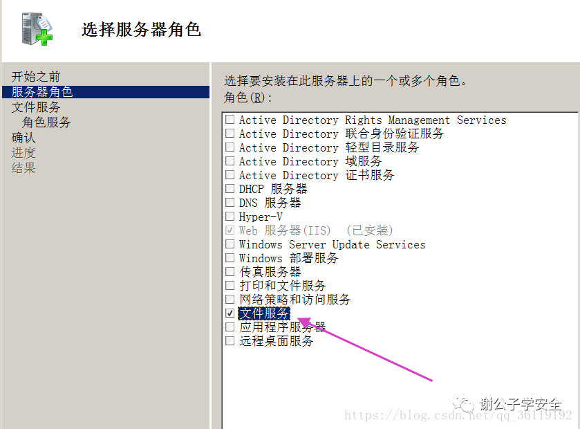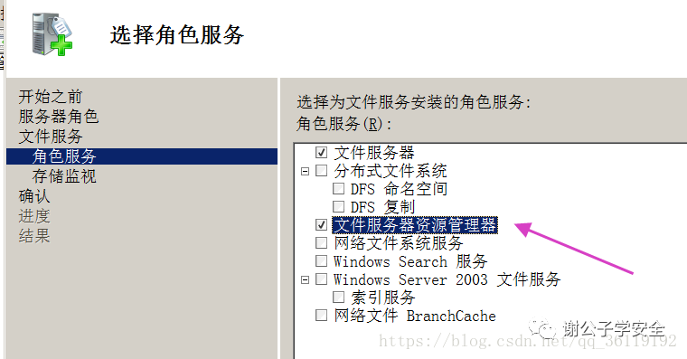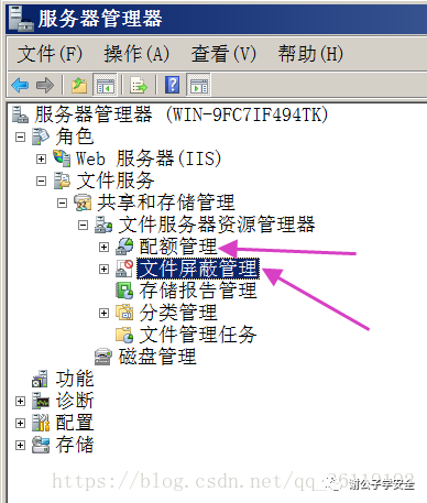 角色,添加角色,选择文件服务,然后再选择文件服务器资源管理器,接着选择磁盘安装即可