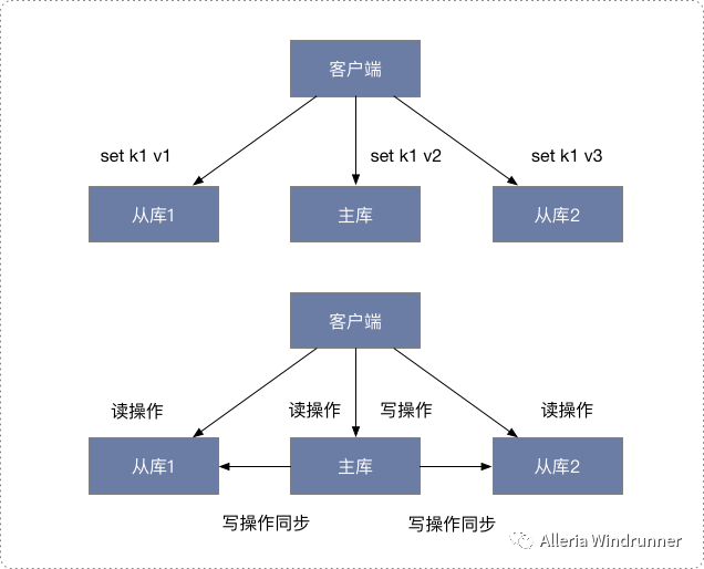 你可以设想一下,如果在上图中,不管是主库还是从库,都能接收客户端的写操作,那么,一个直接的问题就是:如果客户端对同一个数据(例如 k1)前后修改了三次,每一次的修改请求都发送到不同的实例上,在不同的实例上执行,那么,这个数据在这三个实例上的副本就不一致了(分别是 v1、v2 和 v3)。在读取这个数据的时候,就可能读取到旧的值。
