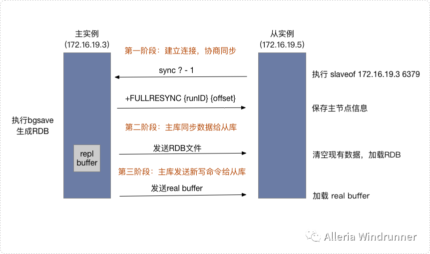 接下来,我们来看一下主从库间数据第一次同步的三个阶段了。你可以先看一下下面这张图,有个整体感知,接下来我们再具体剖析。