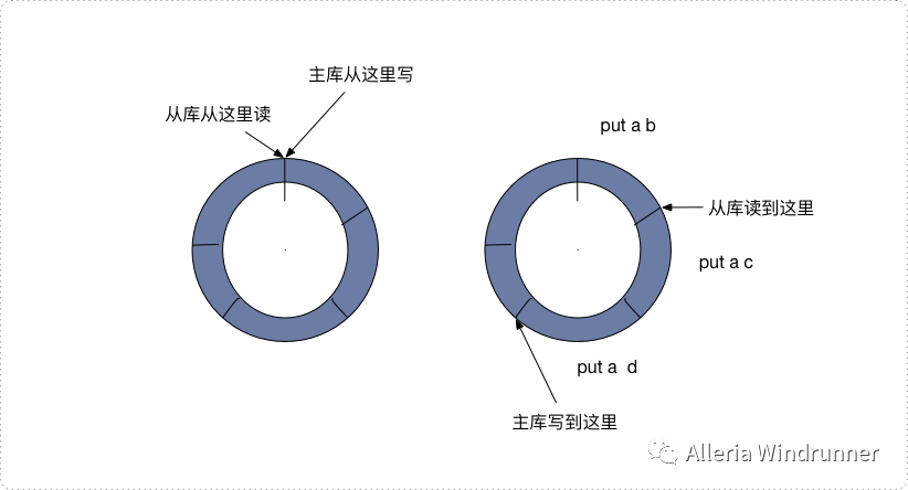 就像上图图的中间部分,主库和从库之间相差了 put a c 和 put a d 两个操作,在增量复制时,主库只需要把它们同步给从库,就行了。不过,有一个地方我要强调一下,因为 repl\_backlog\_buffer 是一个环形缓冲区,所以在缓冲区写满后,主库会继续写入,此时,就会覆盖掉之前写入的操作。如果从库的读取速度比较慢,就有可能导致从库还未读取的操作被主库新写的操作覆盖了,这会导致主从库间的数据不一致。因此,我们要想办法避免这一情况,一般而言,我们可以调整 repl_backlog_size 这个参数。这个参数和所需的缓冲空间大小有关。缓冲空间的计算公式是:缓冲空间大小 = 主库写入命令速度 * 操作大小 - 主从库间网络传输命令速度 * 操作大小。在实际应用中,考虑到可能存在一些突发的请求压力,我们通常需要把这个缓冲空间扩大一倍,即 repl_backlog_size = 缓冲空间大小 * 2,这也就是 repl_backlog_size 的最终值。举个例子,如果主库每秒写入 2000 个操作,每个操作的大小为 2KB,网络每秒能传输 1000 个操作,那么,有 1000 个操作需要缓冲起来,这就至少需要 2MB 的缓冲空间。否则,新写的命令就会覆盖掉旧操作了。为了应对可能的突发压力,我们最终把 repl_backlog_size 设为 4MB。这样一来,增量复制时主从库的数据不一致风险就降低了。不过,如果并发请求量非常大,连两倍的缓冲空间都存不下新操作请求的话,此时,主从库数据仍然可能不一致。针对这种情况,一方面,你可以根据 Redis 所在服务器的内存资源再适当增加 repl_backlog_size 值,比如说设置成缓冲空间大小的 4 倍,另一方面,你可以考虑使用切片集群来分担单个主库的请求压力。