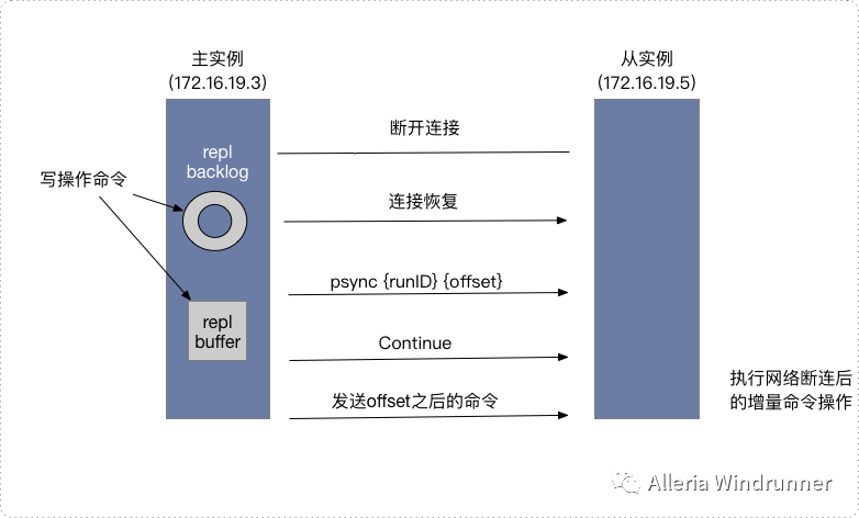 主从库的连接恢复之后,从库首先会给主库发送 psync 命令,并把自己当前的 slave_repl_offset 发给主库,主库会判断自己的 master_repl_offset 和 slave_repl_offset 之间的差距。在网络断连阶段,主库可能会收到新的写操作命令,所以,一般来说,master_repl_offset 会大于 slave_repl_offset。此时,主库只用把 master_repl_offset 和 slave_repl_offset 之间的命令操作同步给从库就行。