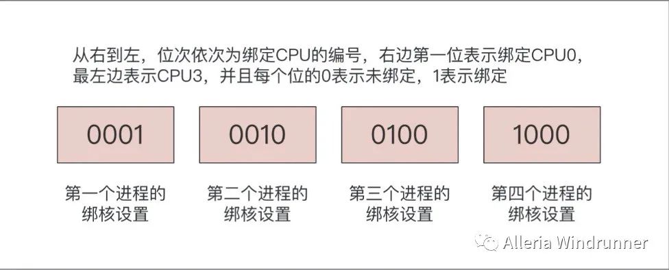 worker_cpu_affinity:绑核的目的,上面也已经介绍过了。当我们了解了机器的配置,以及部署在机器的应用以后,我们就可以合理地分配 CPU 资源,以 4 核 CPU 绑核为例,其绑定语法如下:worker_cpu_affinity 0001 0010 0100 1000;