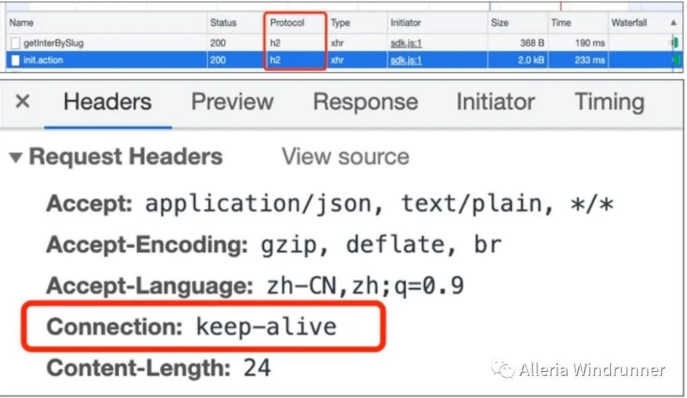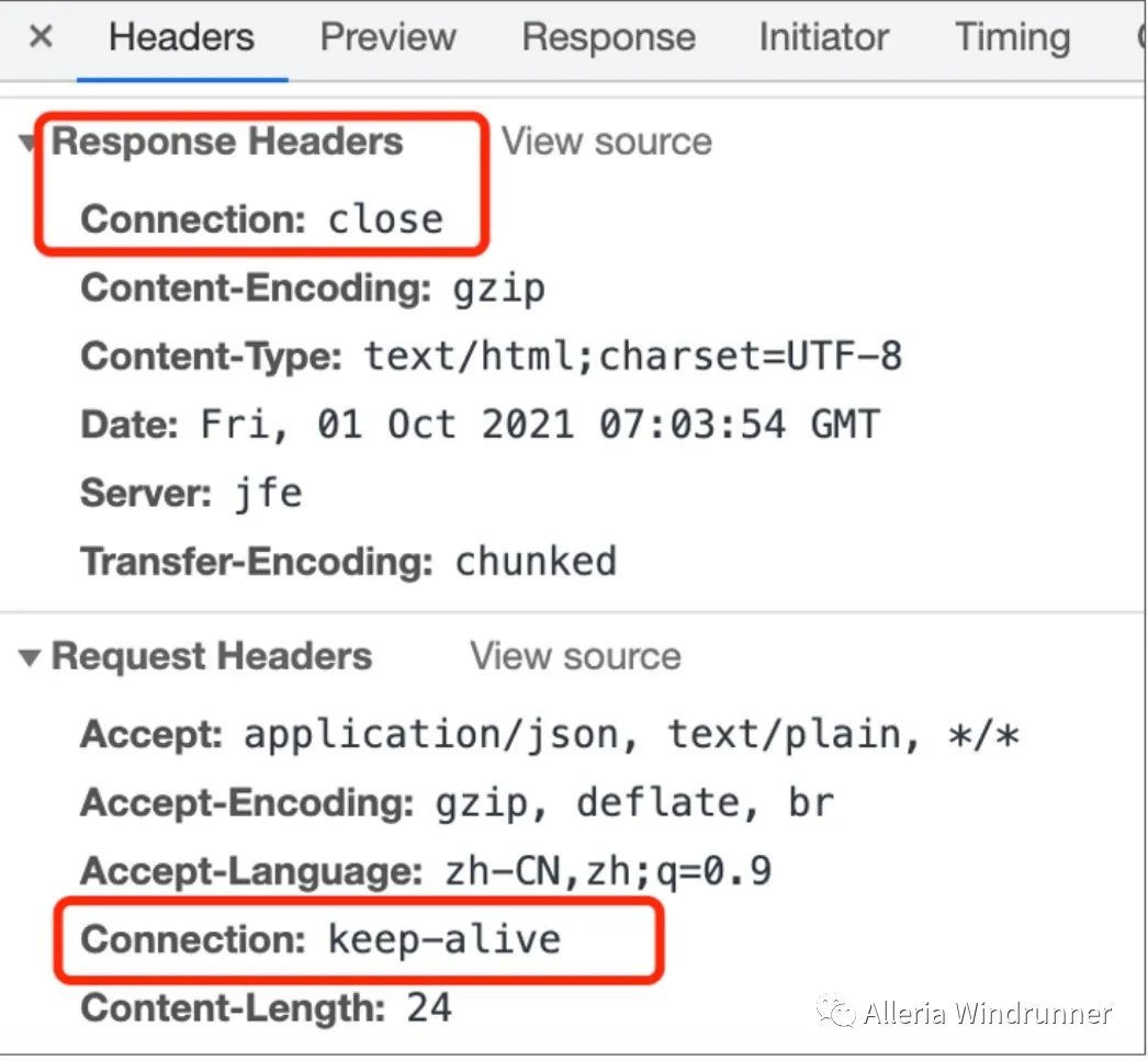 协议版本是 HTTP2.0 的话,如果没有特殊配置,请求头里会有 keep-alive 的设置。但我们可以在 Nginx 通过配置空闲连接的存活时间为 0,来关闭长连接,使其变成短连接。效果如下: