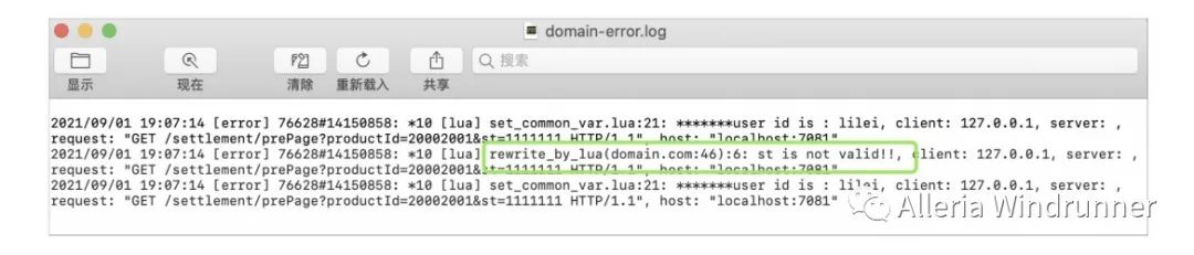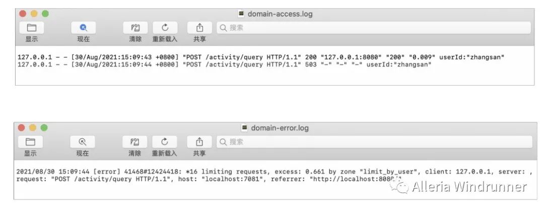 通过 domain-access.log 日志可以看到,两次请求,第一次正常返回,第二次返回给客户端 503 的状态码,原因通过 domain-error.log 可以看到,是触发了根据用户 ID 的限流规则,这样我们的限流防刷功能就实现了。