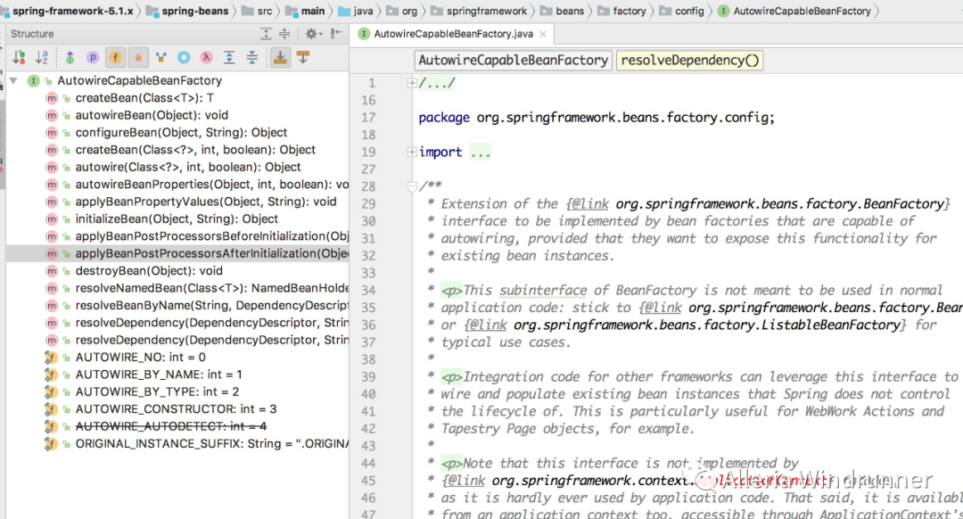 //忽略自动装配的依赖类型void ignoreDependencyInterface(Class<?> ifc);//忽略自动装配的接口/** 注册一个可分解的依赖*/void registerResolvableDependency(Class<?> dependencyType, ObjectautowiredValue);/** 判断指定的Bean是否有资格作为自动装配的候选者*/boolean isAutowireCandidate(String beanName, DependencyDescriptor descriptor) throws NoSuchBeanDefinitionException;// 返回注册的Bean定义BeanDefinition getBeanDefinition(String beanName) throwsNoSuchBeanDefinitionException;// 暂时冻结所有的Bean配置void freezeConfiguration();// 判断本工厂配置是否被冻结boolean isConfigurationFrozen();// 使所有的非延迟加载的单例类都实例化。void preInstantiateSingletons() throws BeansException;}