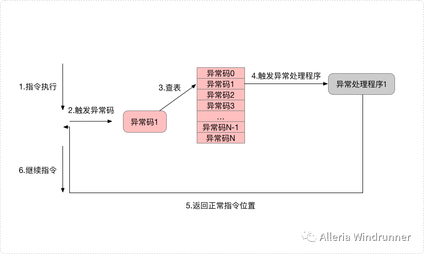 尽管,这里我把这些硬件和系统相关的异常,叫作“硬件异常”。但是,实际上,这些异常,既有来自硬件的,也有来自软件层面的。比如,我们在硬件层面,当加法器进行两个数相加的时候,会遇到算术溢出;或者,你在玩游戏的时候,按下键盘发送了一个信号给到 CPU,CPU 要去执行一个现有流程之外的指令,这也是一个“异常”。同样,来自软件层面的,比如我们的程序进行系统调用,发起一个读文件的请求。这样应用程序向系统调用发起请求的情况,一样是通过“异常”来实现的。关于异常,最有意思的一点就是,它其实是一个硬件和软件组合到一起的处理过程。异常的前半生,也就是异常的发生和捕捉,是在硬件层面完成的。但是异常的后半生,也就是说,异常的处理,其实是由软件来完成的。计算机会为每一种可能会发生的异常,分配一个异常代码(Exception Number)。有些教科书会把异常代码叫作中断向量(Interrupt Vector)。异常发生的时候,通常是 CPU 检测到了一个特殊的信号。比如,你按下键盘上的按键,输入设备就会给 CPU 发一个信号。或者,正在执行的指令发生了加法溢出,同样,我们可以有一个进位溢出的信号。这些信号呢,在组成原理里面,我们一般叫作发生了一个事件(Event)。CPU 在检测到事件的时候,其实也就拿到了对应的异常代码。这些异常代码里,I/O 发出的信号的异常代码,是由操作系统来分配的,也就是由软件来设定的。而像加法溢出这样的异常代码,则是由 CPU 预先分配好的,也就是由硬件来分配的。这又是另一个软件和硬件共同组合来处理异常的过程。拿到异常代码之后,CPU 就会触发异常处理的流程。计算机在内存里,会保留一个异常表(Exception Table)。也有地方,把这个表叫作中断向量表(Interrupt Vector Table),好和上面的中断向量对应起来。这个异常表有点儿像我们在静态链接那篇里讲的 GOT 表,存放的是不同的异常代码对应的异常处理程序(Exception Handler)所在的地址。我们的 CPU 在拿到了异常码之后,会先把当前的程序执行的现场,保存到程序栈里面,然后根据异常码查询,找到对应的异常处理程序,最后把后续指令执行的指挥权,交给这个异常处理程序。
