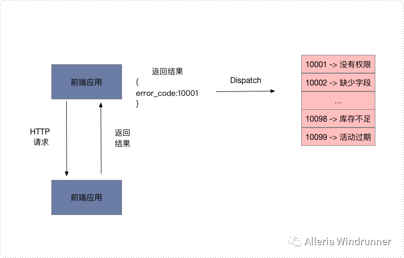 比如说,现在我们日常进行的 Web 或者 App 开发,通常都是前后端分离的。前端的应用,会向后端发起 HTTP 的请求。当后端遇到了异常,通常会给到前端一个对应的错误代码。前端的应用根据这个错误代码,在应用层面去进行错误处理。在不能处理的时候,它会根据错误代码向用户显示错误信息。