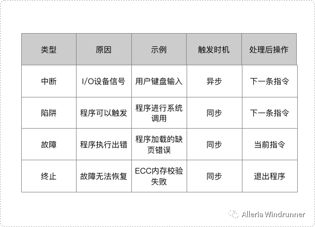 第二种异常叫陷阱(Trap)。陷阱,其实是我们程序员“故意“主动触发的异常。就好像你在程序里面打了一个断点,这个断点就是设下的一个"陷阱"。当程序的指令执行到这个位置的时候,就掉到了这个陷阱当中。然后,对应的异常处理程序就会来处理这个"陷阱"当中的猎物。最常见的一类陷阱,发生在我们的应用程序调用系统调用的时候,也就是从程序的用户态切换到内核态的时候。我们可以用 Linux 下的 time 指令,去查看一个程序运行实际花费的时间,里面有在用户态花费的时间(user time),也有在内核态发生的时间(system time)。我们的应用程序通过系统调用去读取文件、创建进程,其实也是通过触发一次陷阱来进行的。这是因为,我们用户态的应用程序没有权限来做这些事情,需要把对应的流程转交给有权限的异常处理程序来进行。第三种异常叫故障(Fault)。它和陷阱的区别在于,陷阱是我们开发程序的时候刻意触发的异常,而故障通常不是。比如,我们在程序执行的过程中,进行加法计算发生了溢出,其实就是故障类型的异常。这个异常不是我们在开发的时候计划内的,也一样需要有对应的异常处理程序去处理。故障和陷阱、中断的一个重要区别是,故障在异常程序处理完成之后,仍然回来处理当前的指令,而不是去执行程序中的下一条指令。因为当前的指令因为故障的原因并没有成功执行完成。最后一种异常叫中止(Abort)。与其说这是一种异常类型,不如说这是故障的一种特殊情况。当 CPU 遇到了故障,但是恢复不过来的时候,程序就不得不中止了。在这四种异常里,中断异常的信号来自系统外部,而不是在程序自己执行的过程中,所以我们称之为“异步”类型的异常。而陷阱、故障以及中止类型的异常,是在程序执行的过程中发生的,所以我们称之为“同步“类型的异常。在处理异常的过程当中,无论是异步的中断,还是同步的陷阱和故障,我们都是采用同一套处理流程,也就是上面所说的,“保存现场、异常代码查询、异常处理程序调用“。而中止类型的异常,其实是在故障类型异常的一种特殊情况。当故障发生,但是我们发现没有异常处理程序能够处理这种异常的情况下,程序就不得不进入中止状态,也就是最终会退出当前的程序执行。