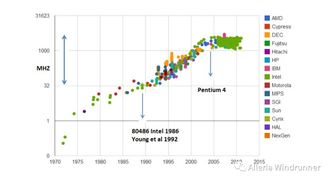 然而,计算机科学界从来不相信“大力出奇迹”。奔腾 4 的 CPU 主频从来没有达到过 10GHz,最终它的主频上限定格在 3.8GHz。这还不是最糟的,更糟糕的事情是,大家发现,奔腾 4 的主频虽然高,但是它的实际性能却配不上同样的主频。想要用在笔记本上的奔腾 4 2.4GHz 处理器,其性能只和基于奔腾 3 架构的奔腾 M 1.6GHz 处理器差不多。于是,这一次的“大力出悲剧”,不仅让 Intel 的对手 AMD 获得了喘息之机,更是代表着“主频时代”的终结。后面几代 Intel CPU 主频不但没有上升,反而下降了。到如今,2019 年的最高配置 Intel i9 CPU,主频也只不过是 5GHz 而已。相较于 1978 年到 2000 年,这 20 年里 300 倍的主频提升,从 2000 年到现在的这 19 年,CPU 的主频大概提高了 3 倍。