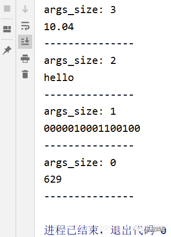 #include <iostream>#include <bitset>void print(){/*不执行任何操作。*/}template <typename T, typename... Types>void print(const T& firstArg, const Types&... args){std::cout << "args_size: " << sizeof...(args) << std::endl;std::cout << firstArg << std::endl;std::cout << "---------------" << std::endl;print(args...);}int main() {print(10.04, "hello", std::bitset<16>(1124), 629);return 0;}