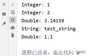 #include <iostream>using namespace std;void handleValue(int value) {cout << "Integer: " << value << endl;}void handleValue(double value) {cout << "Double: " << value << endl;}void handleValue(string_view value) {cout << "String: " << value << endl;}void processValues(){/*不执行任何操作。*/}template<typename T1, typename... Tn>void processValues(T1 arg1, Tn... args) {handleValue(arg1);processValues(args...);}int main() {processValues(1, 2, 3.1415926, "test_string", 1.1f);}