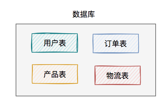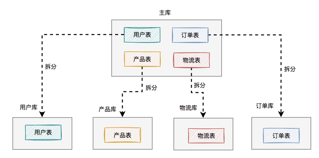 将用户、产品、物流、订单相关的表,从原来一个数据库中,拆分成单独的用户库、产品库、物流库和订单库,一共四个数据库。
