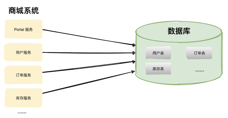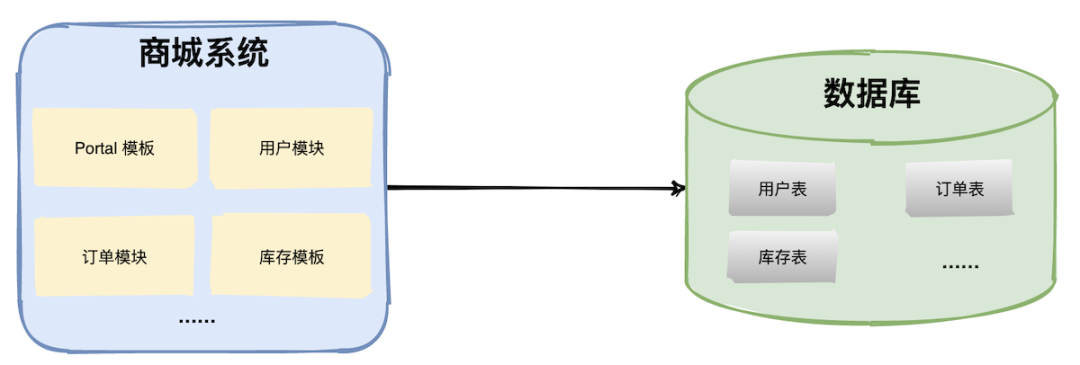 如上图,商城系统包括主页 Portal 模板、用户模块、订单模块、库存模块等,所有的模块都共有一个数据库,通常数据库中有非常多的表。