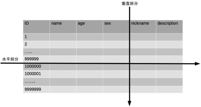 就拿用户表(user)来说,表中有7个字段:id,name,age,sex,nickname,description,如果 nickname 和 description 不常用,我们可以将其拆分为另外一张表:用户详细信息表,这样就由一张用户表拆分为了用户基本信息表+用户详细信息表,两张表结构不一样相互独立。但是从这个角度来看垂直拆分并没有从根本上解决单表数据量过大的问题,因此我们还是需要做一次水平拆分。