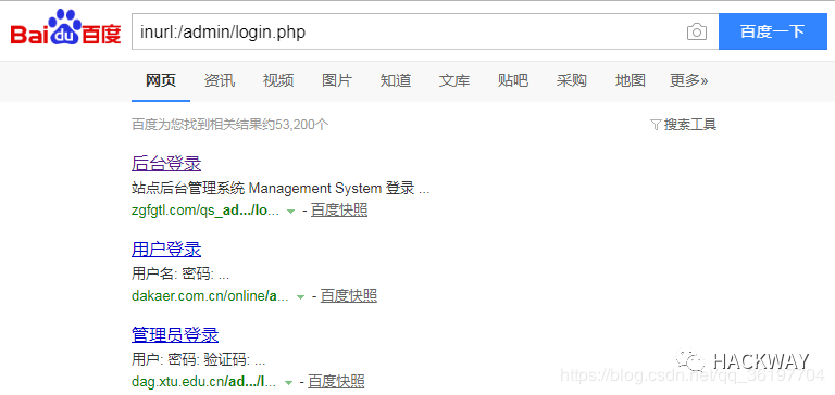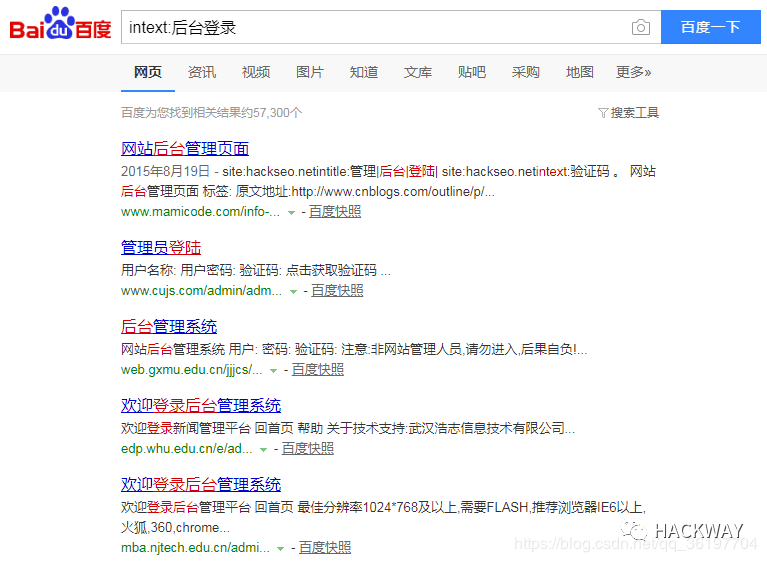 寻找正文中含有关键字的网页,例如: “ intext:后台登录 ” 将返回正文中包含 后台登录 的网页。