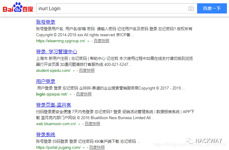 寻找URL中含有关键词的网页:例如:“inurl:Login” 将返回URL中含有“Login”的网页。