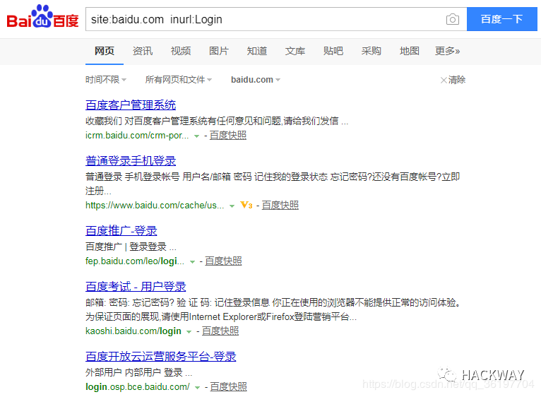 指定访问的站点,例如:“site:baidu.com inurl:Login”,将在baidu.com 中查找URL中含有“Login”的网页。