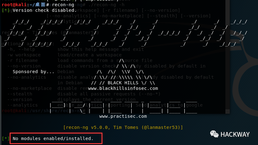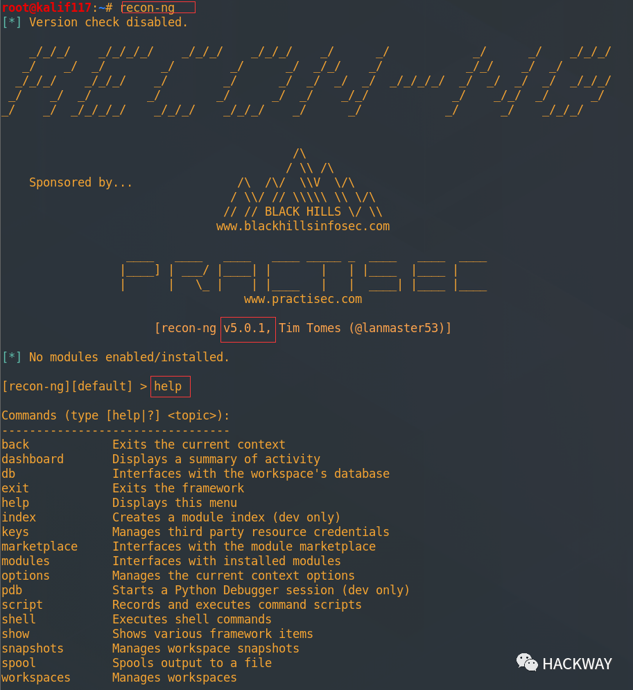 Recon-ng 5 最大的改变是没有模块,需要下载。且命令变化很大。刚启动的时候,会提示“No modules enabled/installed.(未启用/未安装任何模块。)