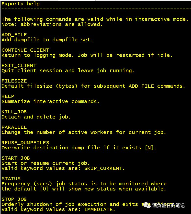 这里可以看到和数据泵很多的信息,比如开始时间,并行度,数据泵当前进度等等。输入help,可以看到很多的可用命令: