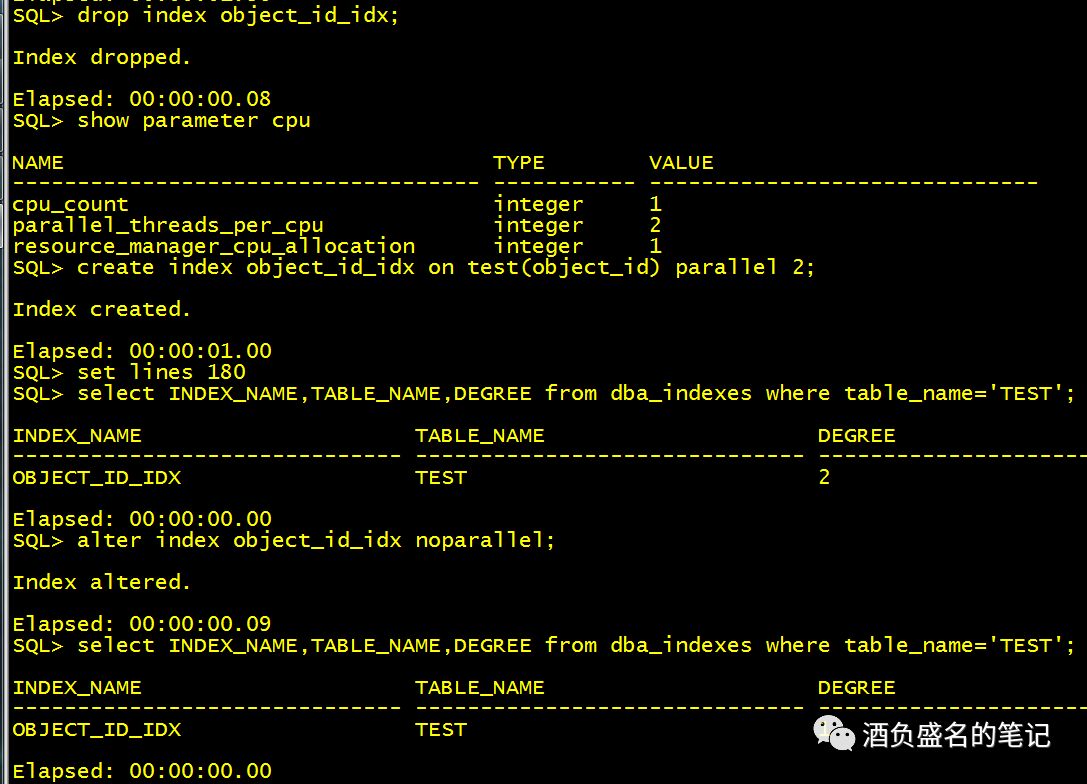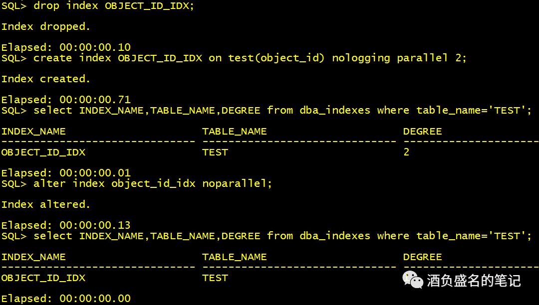 要注意的是在我们用并行来创建或者rebuild索引的时候,我们索引的并行度也会改成我们的并行度,所以在结束后还需要对索引的并行度进行还原。因为索引并行度会影响dml的执行计划,而且还会消耗更多的资源,避免给自己挖坑。
