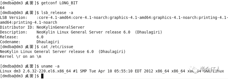 用户在安装 DM 前,需要检查当前操作系统的相关信息,确认 DM 安装程序与当前操作系统匹配,以保证 DM 能够正确安装和运行。用户可以使用以下命令检查操作系统基本信息。如下图所示: