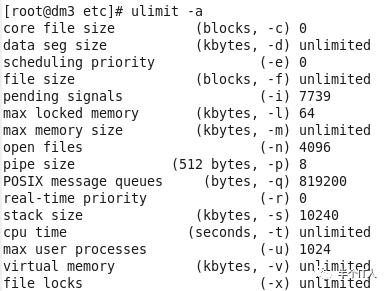 在 Linux(Unix)系统中,因为 ulimit 命令的存在,会对程序使用操作系统资源进行限制。为了使 DM 能够正常运行,建议用户检查当前安装用户的 ulimit 参数。运行 ulimit -a 进行查询。如下图所示: